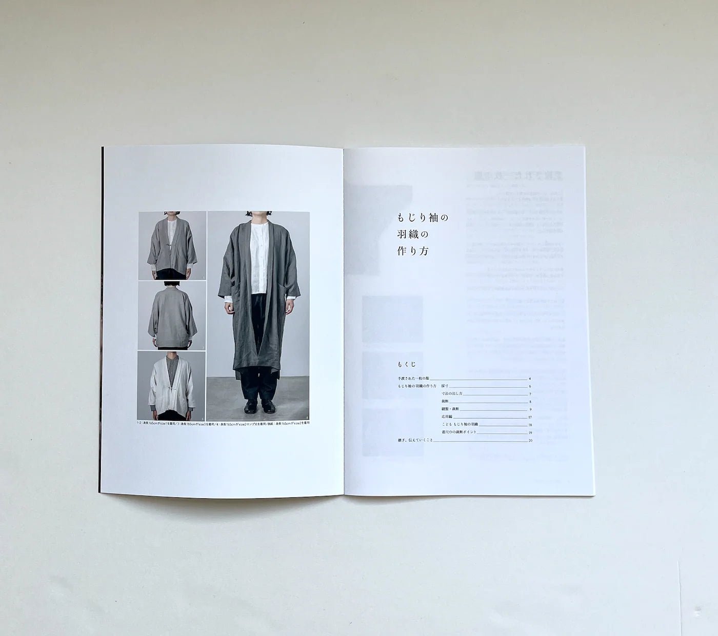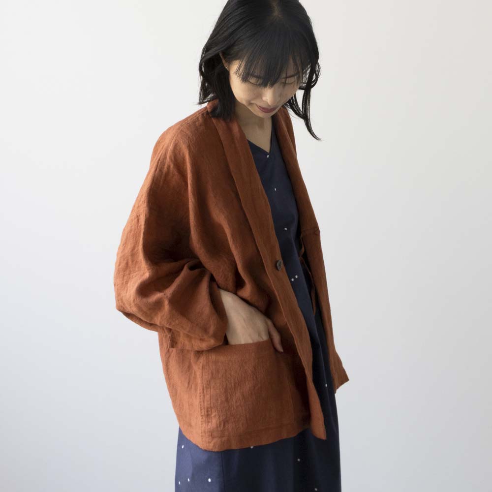 岐阜県・石徹白の集落で作られていた羽織をもとにしたデザインで、型紙なし・直線裁断で仕立てる一着です。