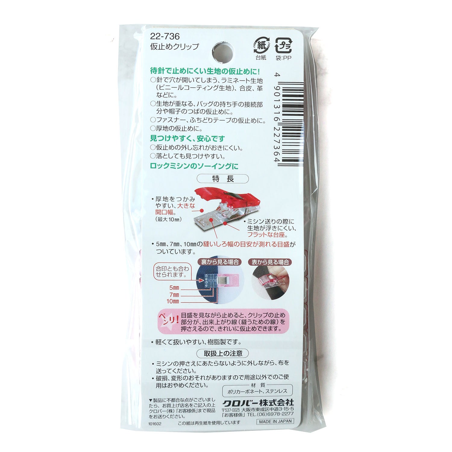 厚地やファスナー、ふちどりテープの仮止めなど、生地が重なる部分のソーイングに便利なクリップです。