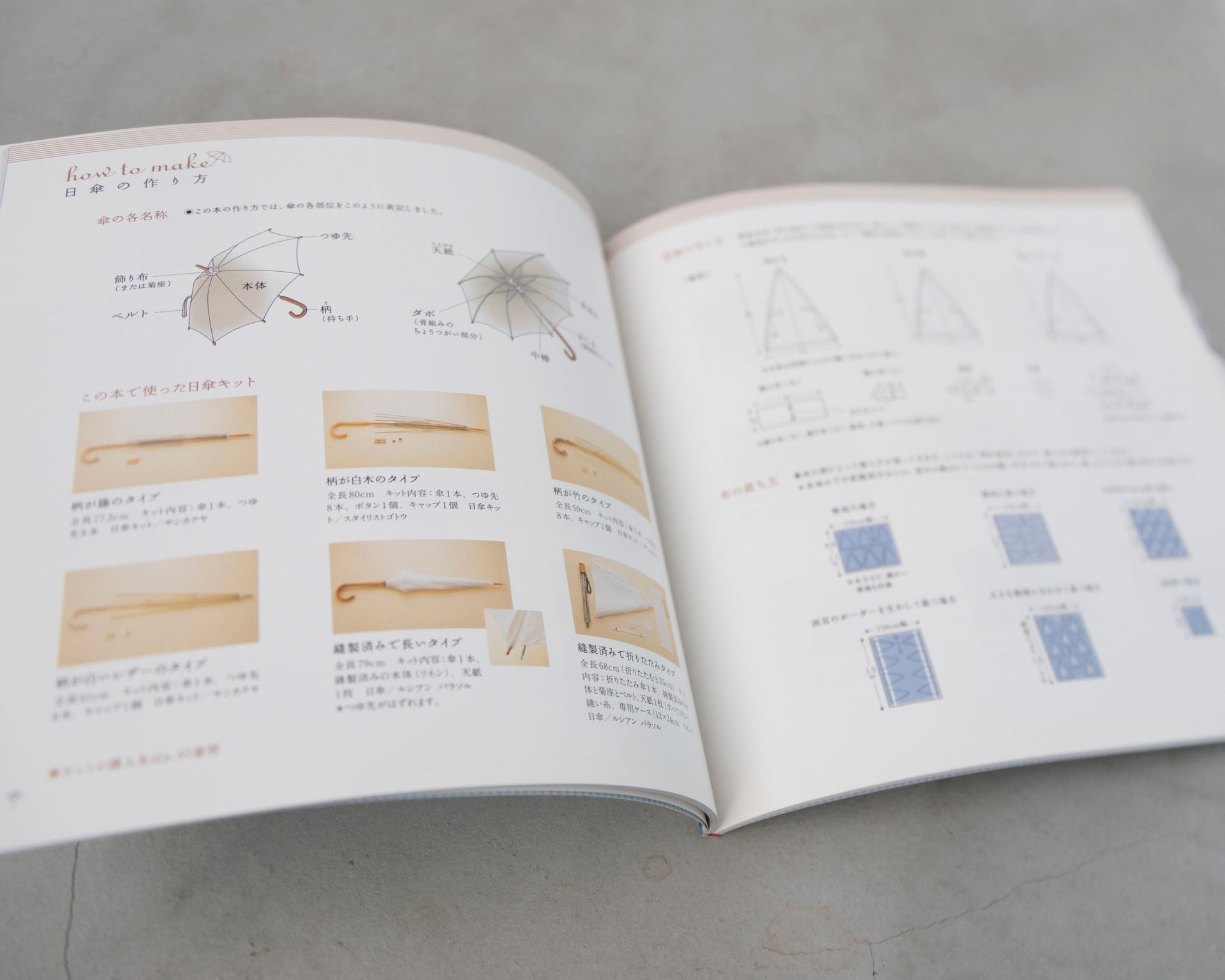 当店で扱っている日傘キットのゴールドストレッチタイプと同じ骨組みのキットが使われています。(本に掲載の"柄がレザー・竹タイプ"が同じものになります。)