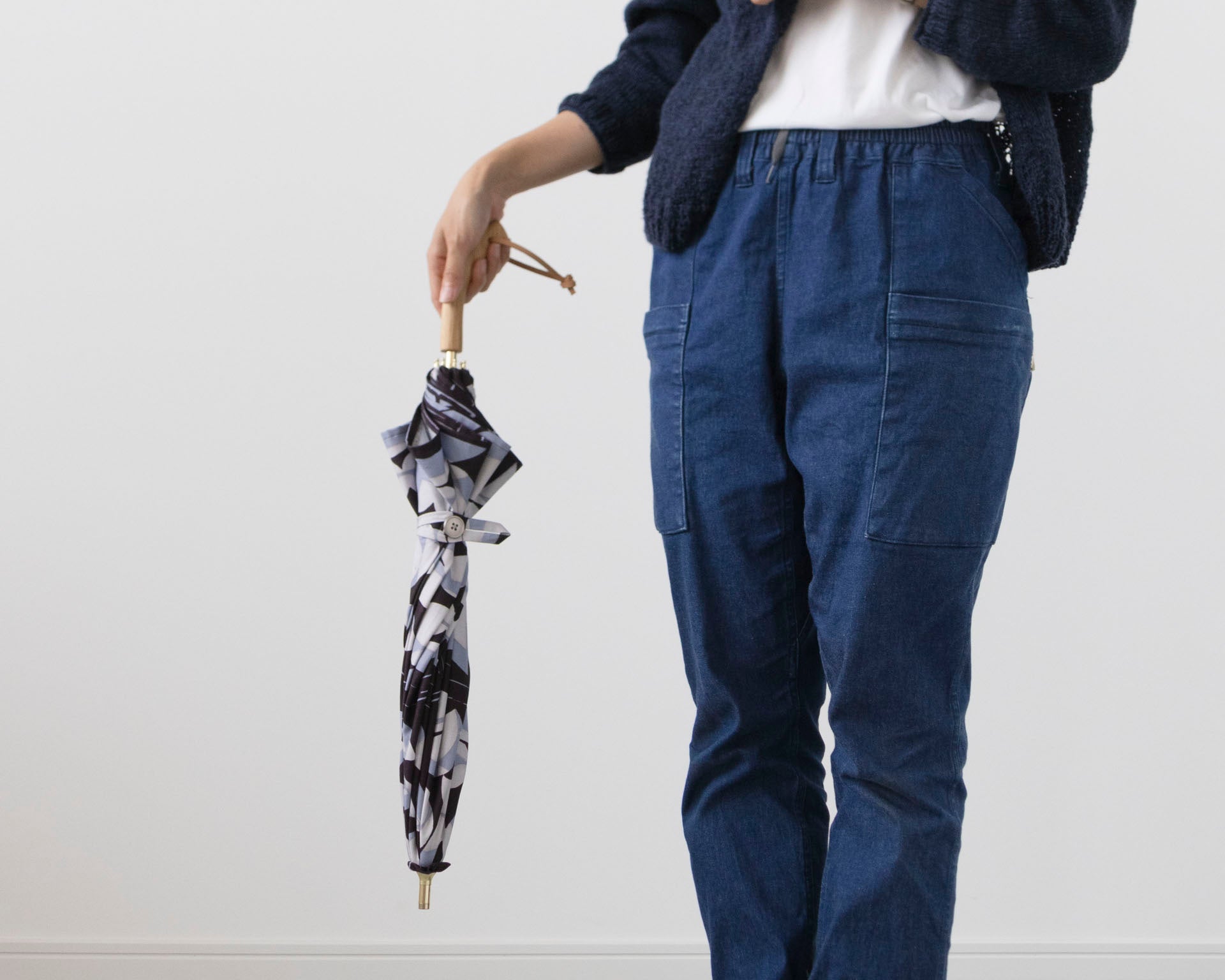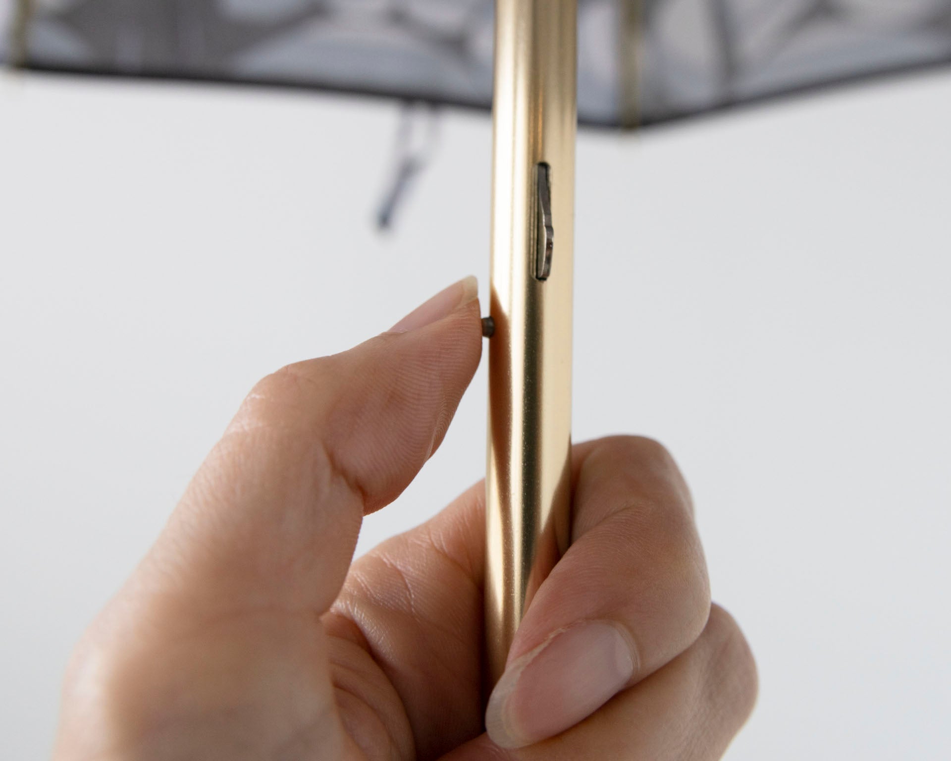 閉じ方:傘を閉じ、そのままボタンを押しながら縮める。