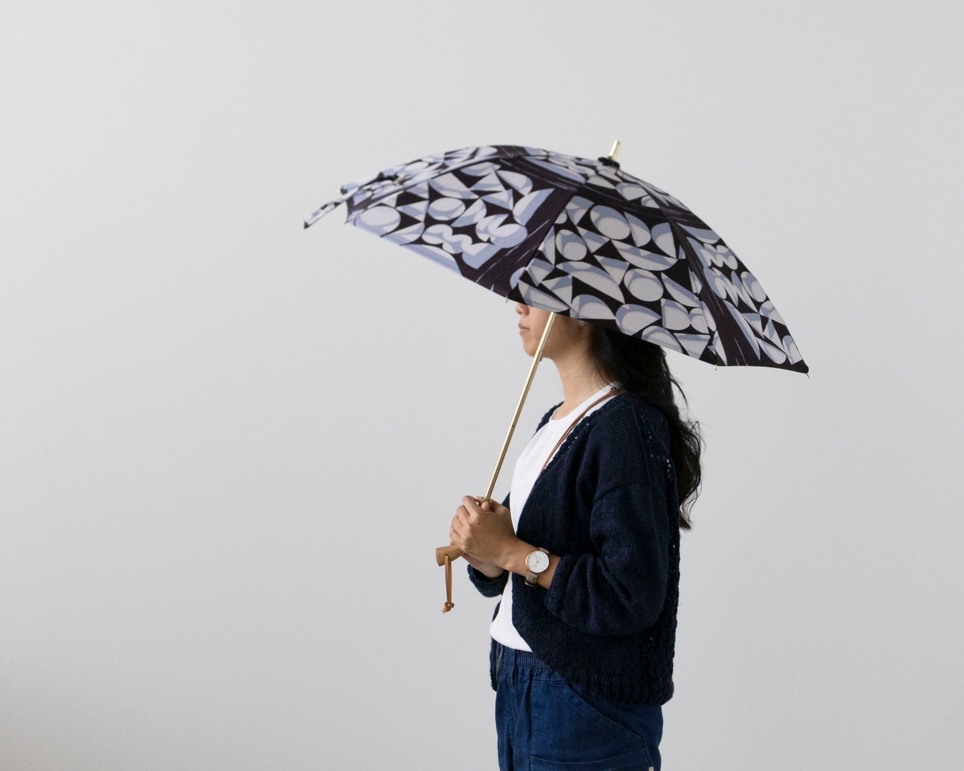 開け方:まず伸ばしてから、ボタンを押して傘を開く。