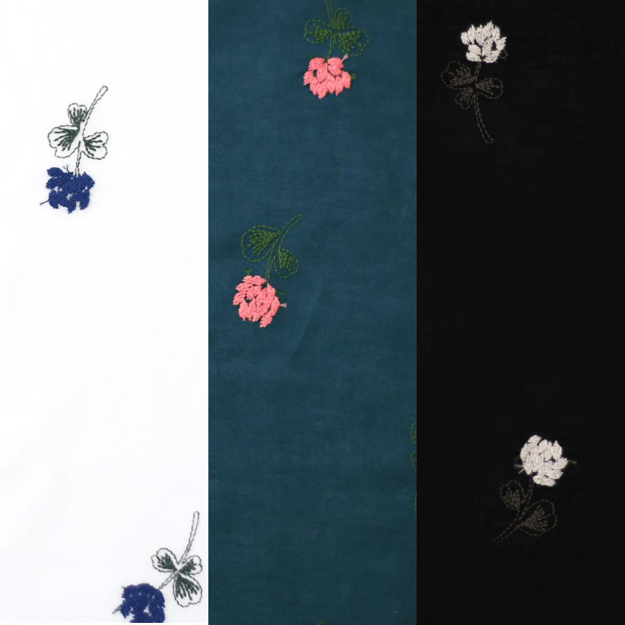庭先や広い野原に広がる小さな野花が、細く繊細な糸で織られた薄手のコットンローンに刺繍されています。花びらはふっくらと刺繍されていて、可憐ながら存在感があります。