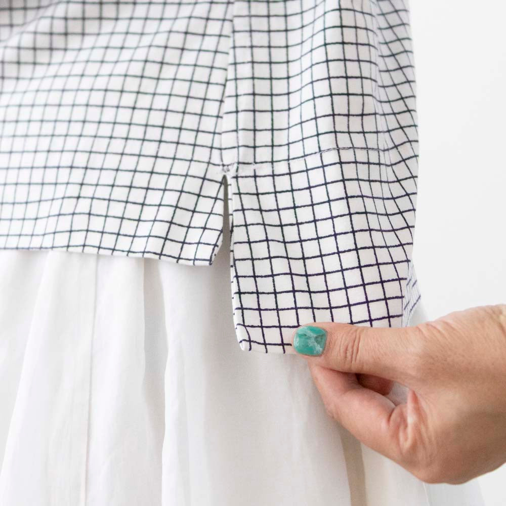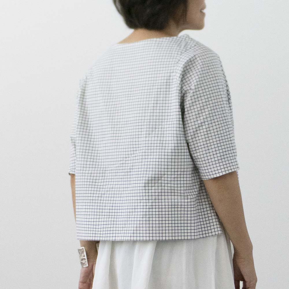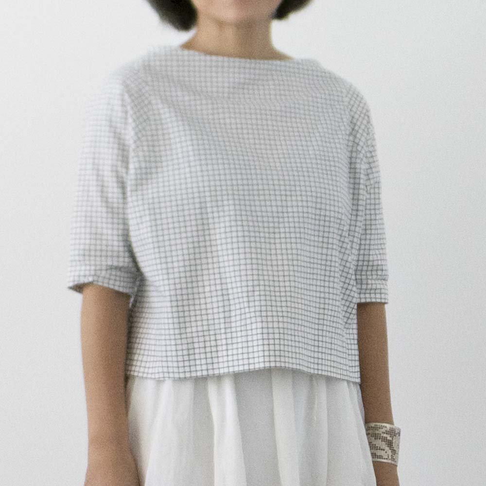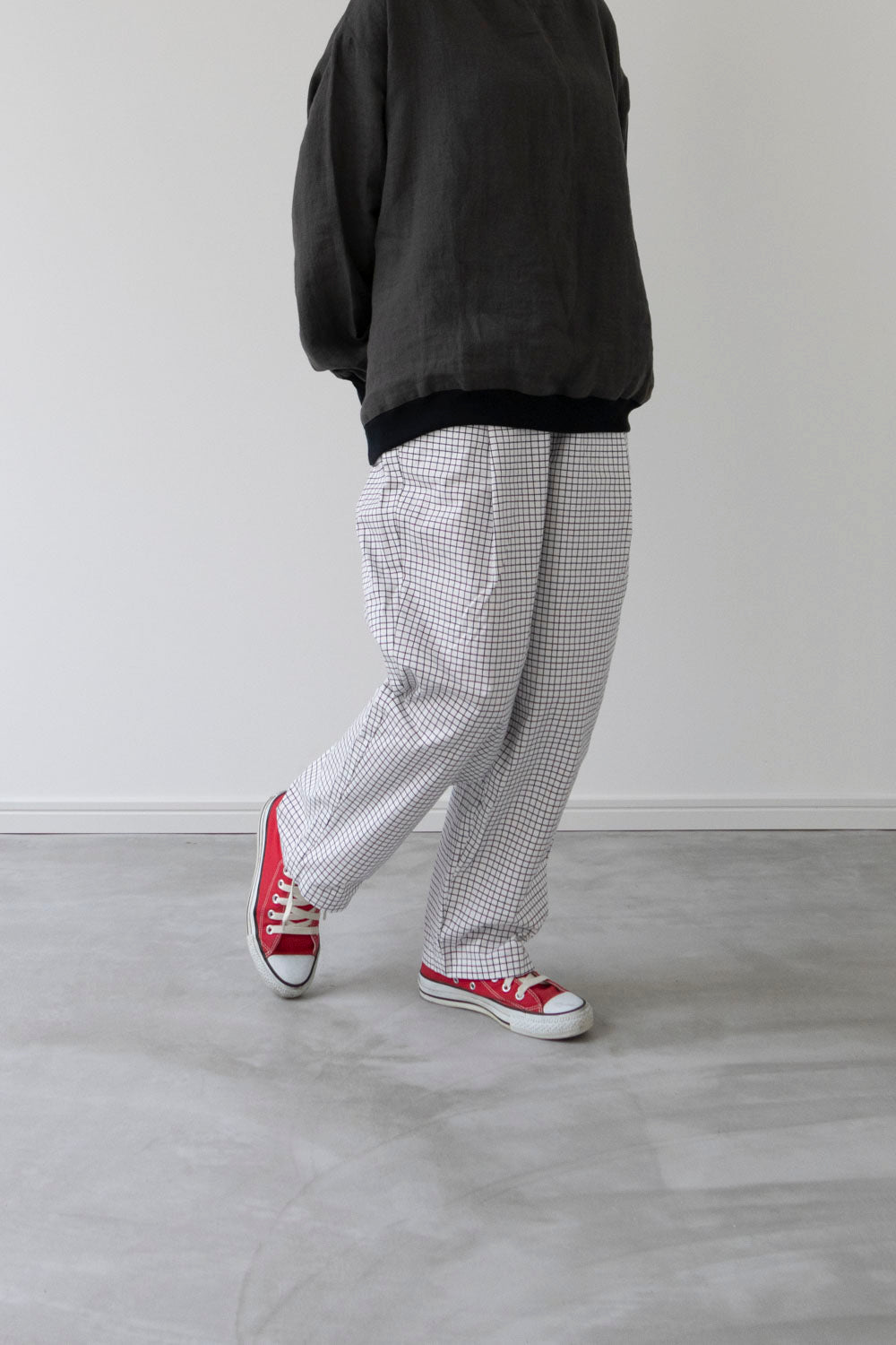- 泳いでいるときに見えるプールの床のタイルをイメージしたチェックプリントの布。揺らぎのある線で描かれた格子模様です。