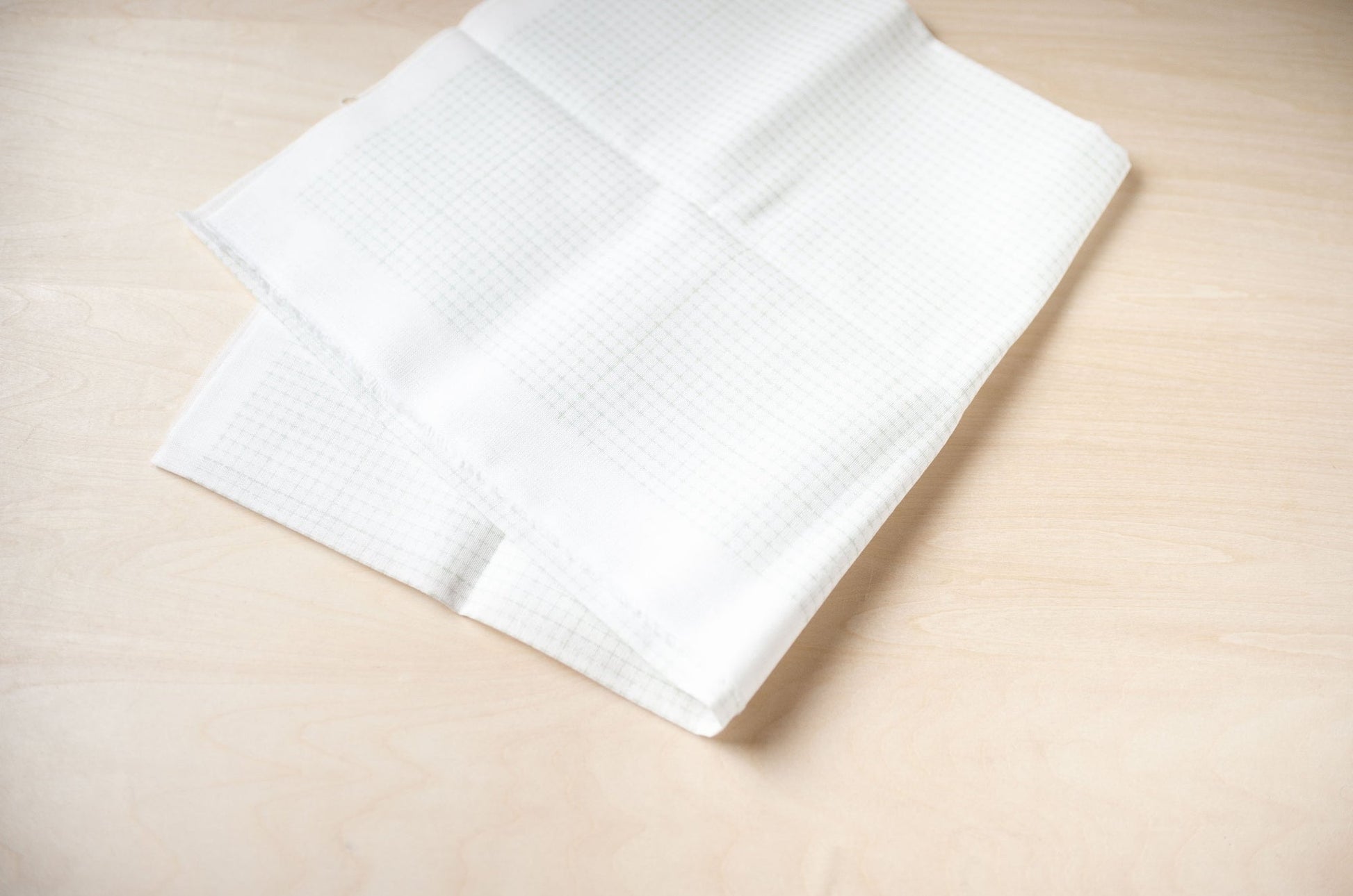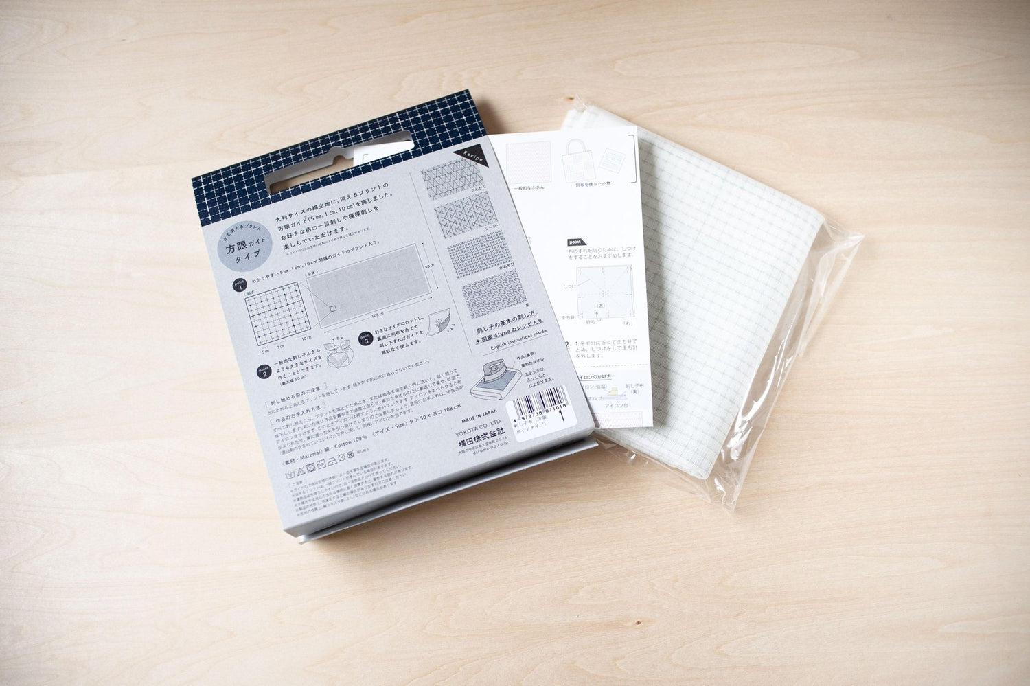 コットン100%の生地に、消えるプリントの方眼ガイドが施された大判の刺し子ふきんです。 方眼ガイドを目安にして、図案をふきんにそのまま写せるので、手間が少なく便利です。