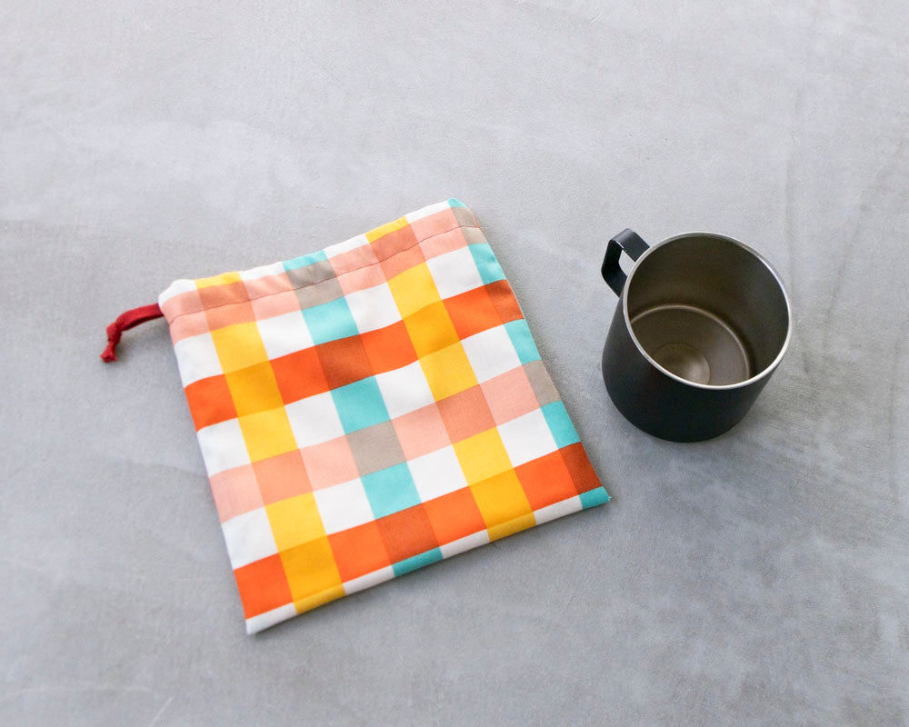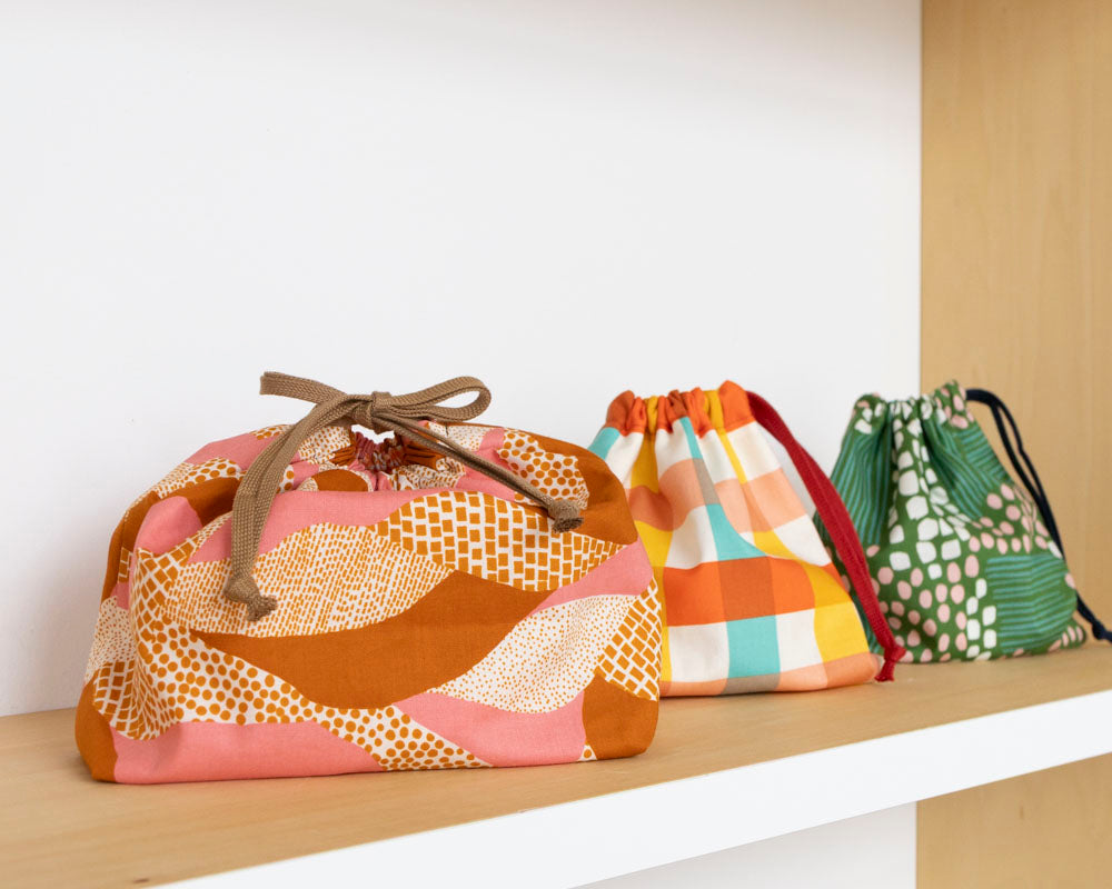・巾着セットは、お揃いの生地で、2種類の巾着(お弁当袋・コップ袋)が作れます。(写真下段)