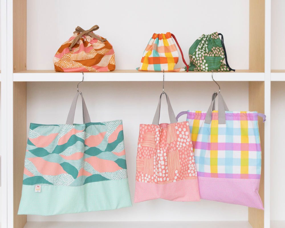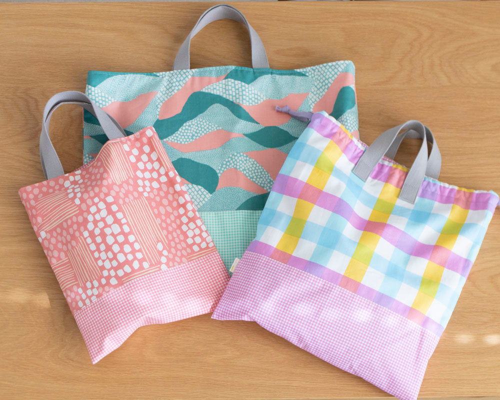 ・バッグセットは、お揃いの生地で、3種類のバッグ(お着替えバッグ・うわぐつバッグ・絵本バッグ)が作れます。(写真上段)