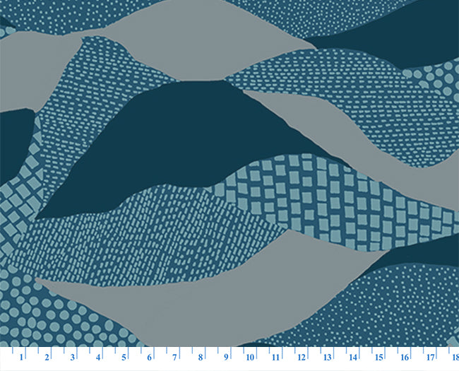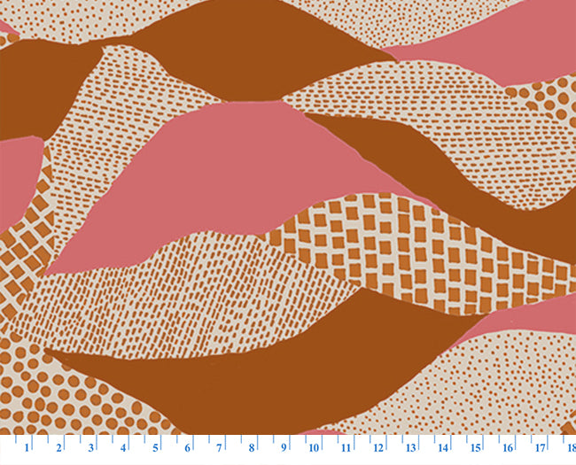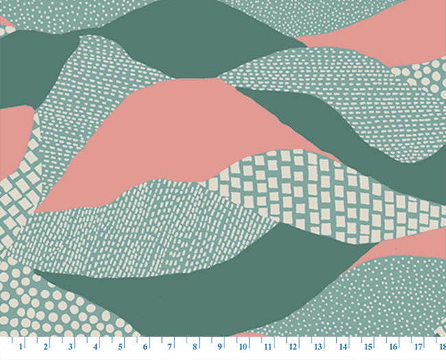 自然の地層や風の流れを思わせる抽象的なラインや点が、淡いグリーンやサドルブラウン、ティールなどの穏やかな色彩で表現されています。