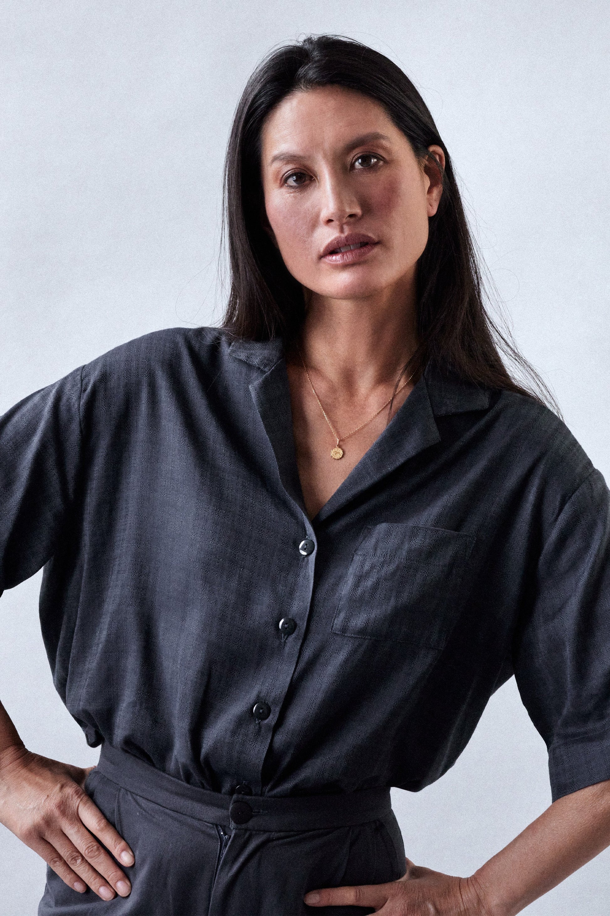 都会的なシャツカラーですが、後ろが前より長めになっているので、リラックス感のあるシルエットに仕上がります。
