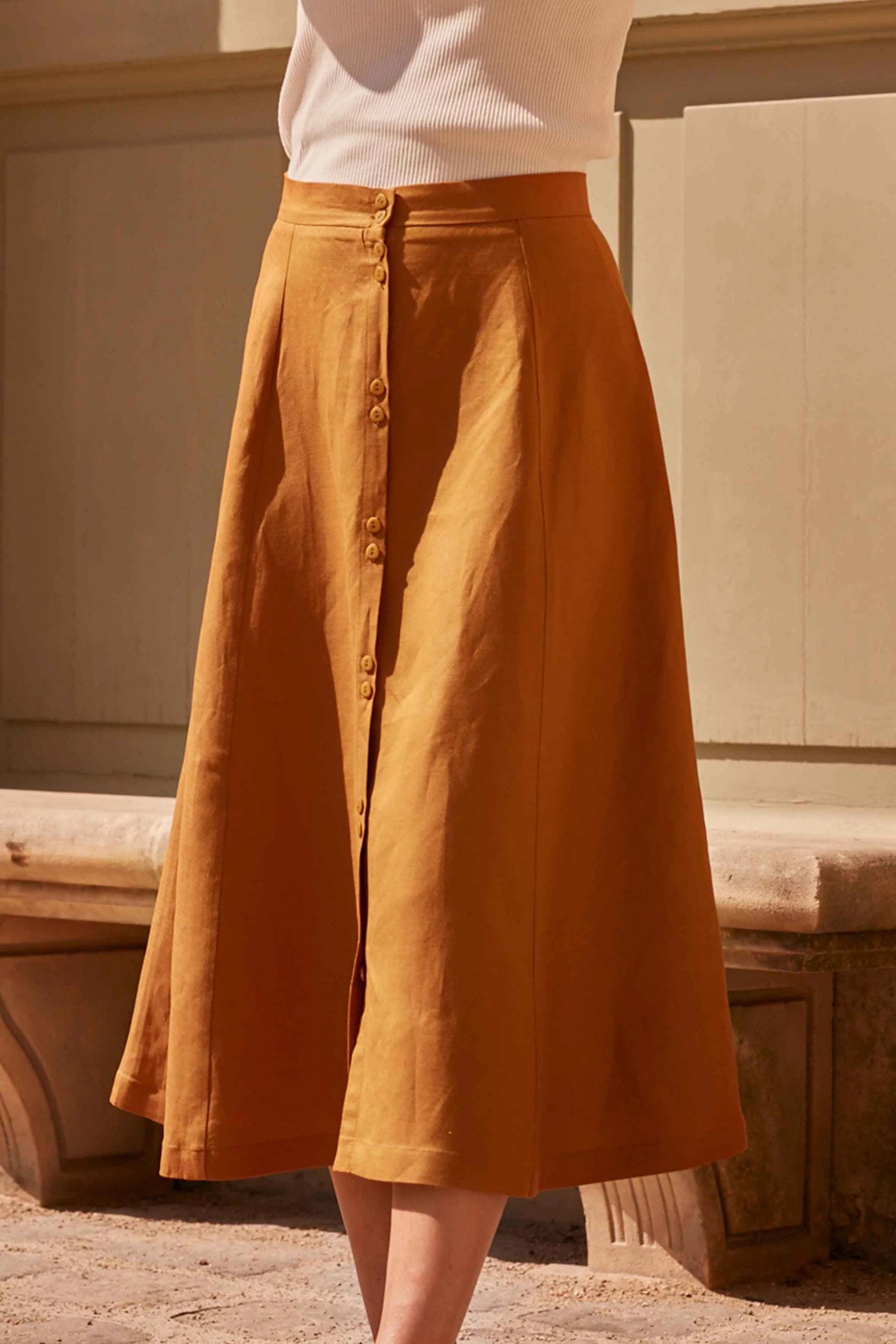 バイアス仕上げのウエストバンドが特徴で、フレアカットがAtelier Brunetteのビスコース生地と相性抜群です。