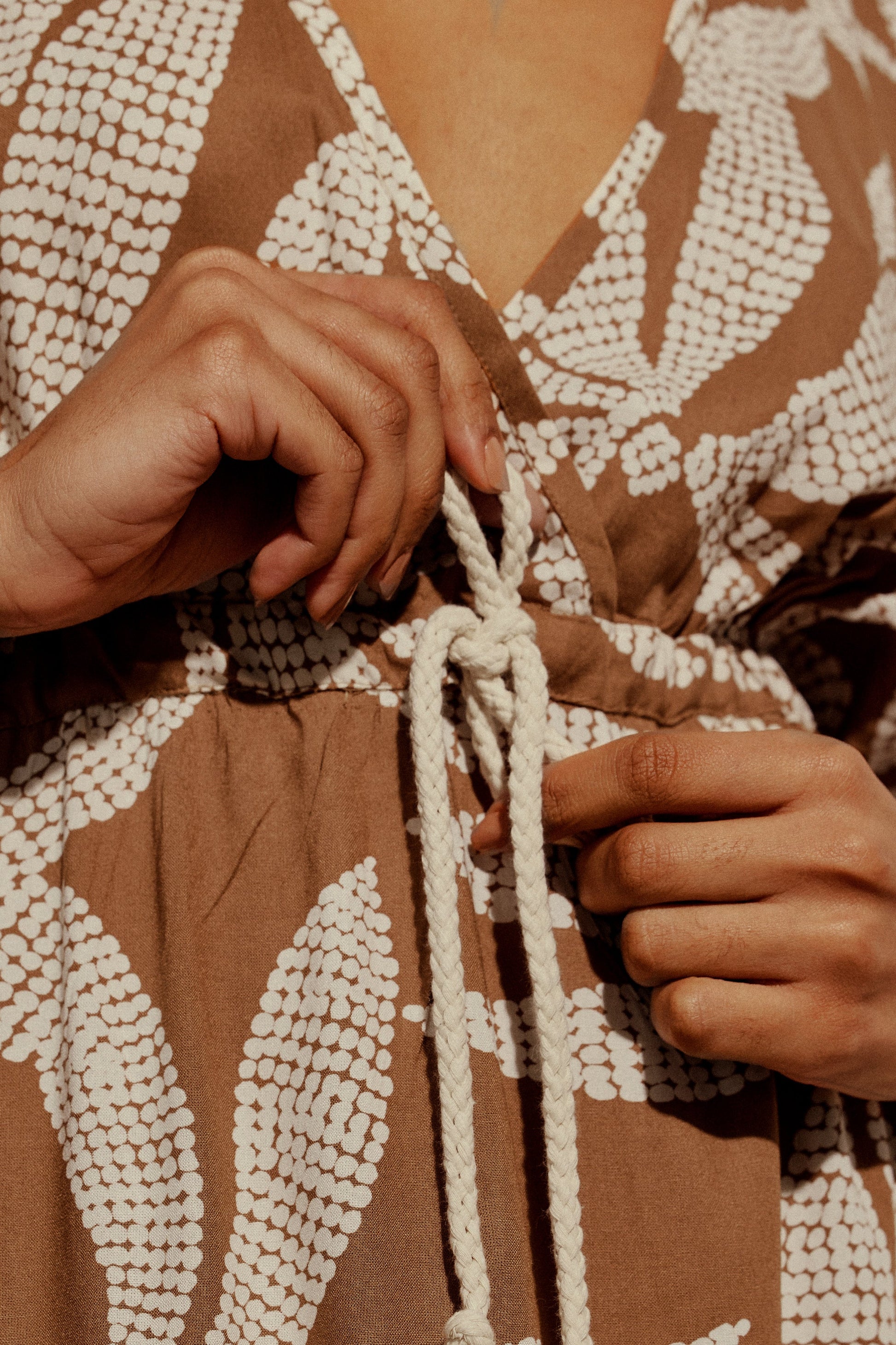 ラップネックラインのドレス。ウエストと袖の可愛らしいギャザーがポイントで、軽やかでフェミニンな印象を与えます。